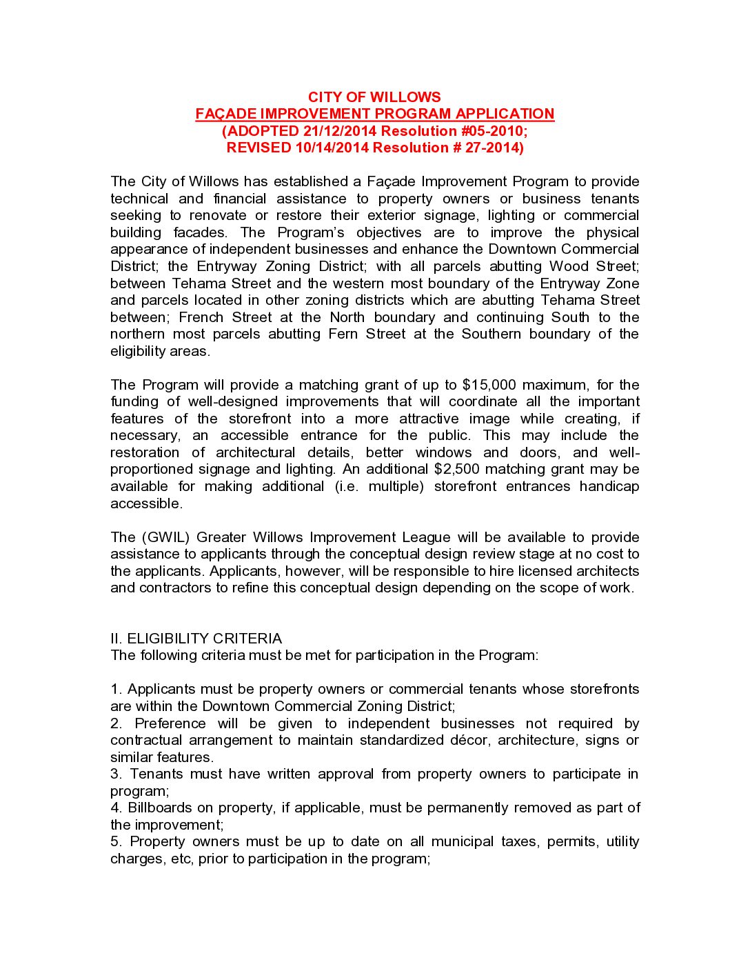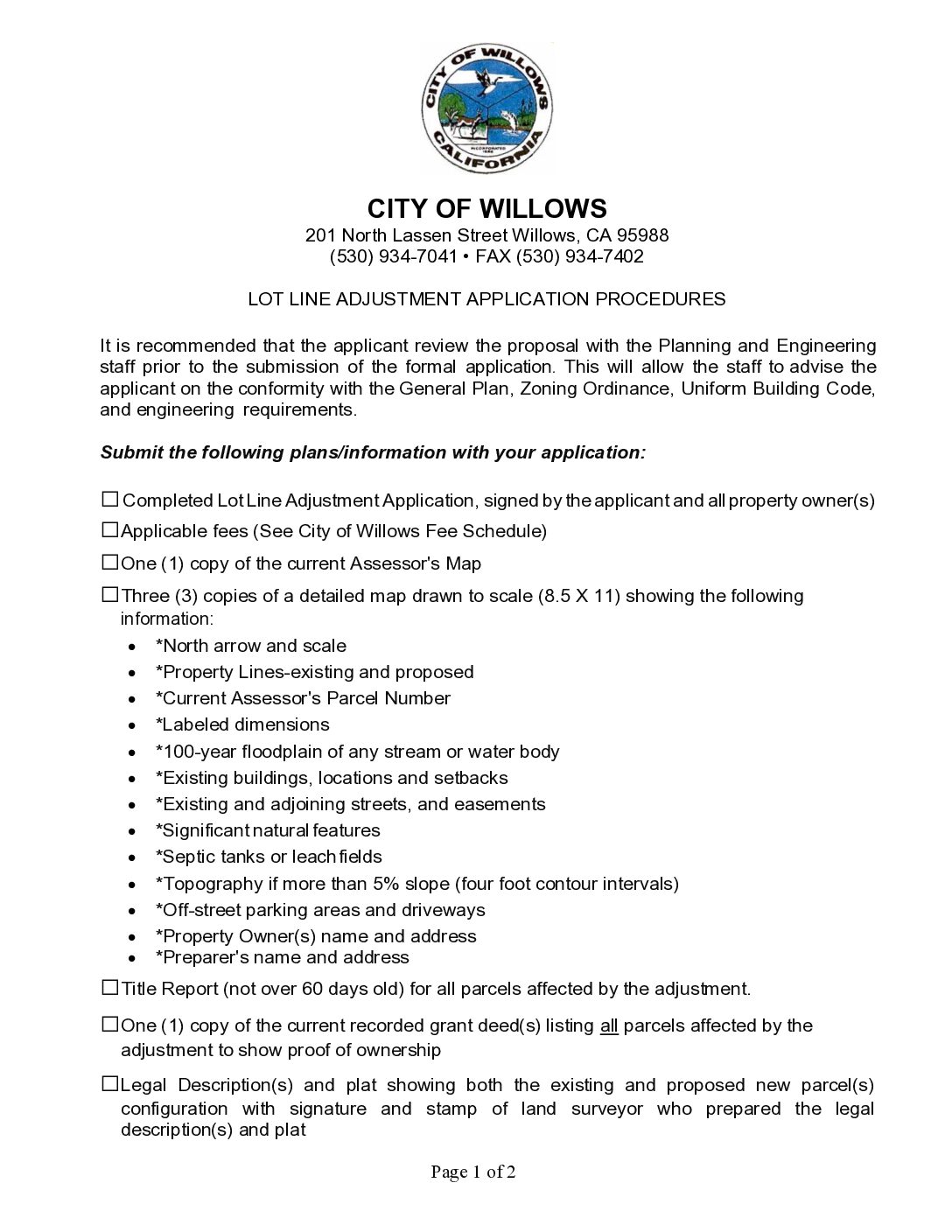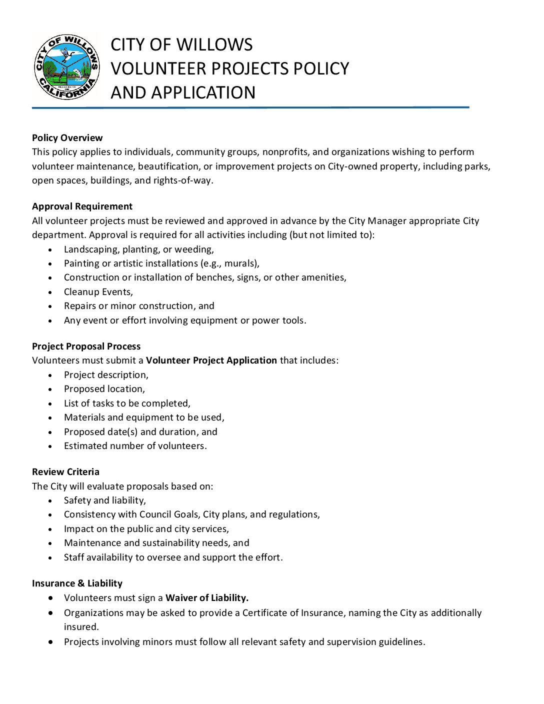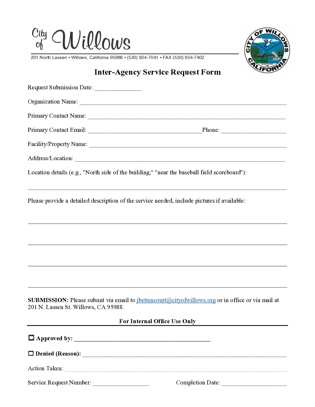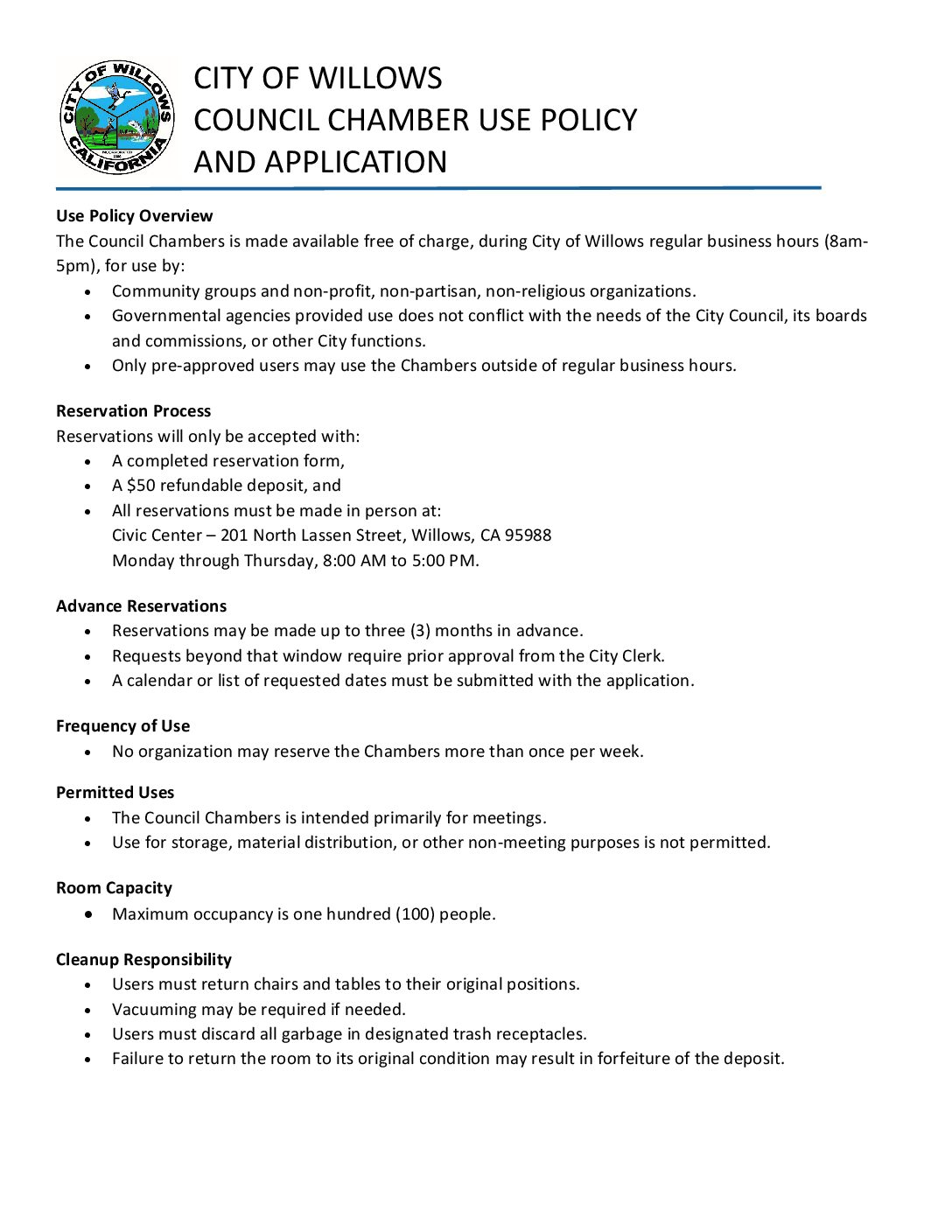 Below are all the public document & Forms pertaining to all of the City of Willows. If can not find what you are looking here. Please check any of the other department Documents & Forms pages, or contact city hall.